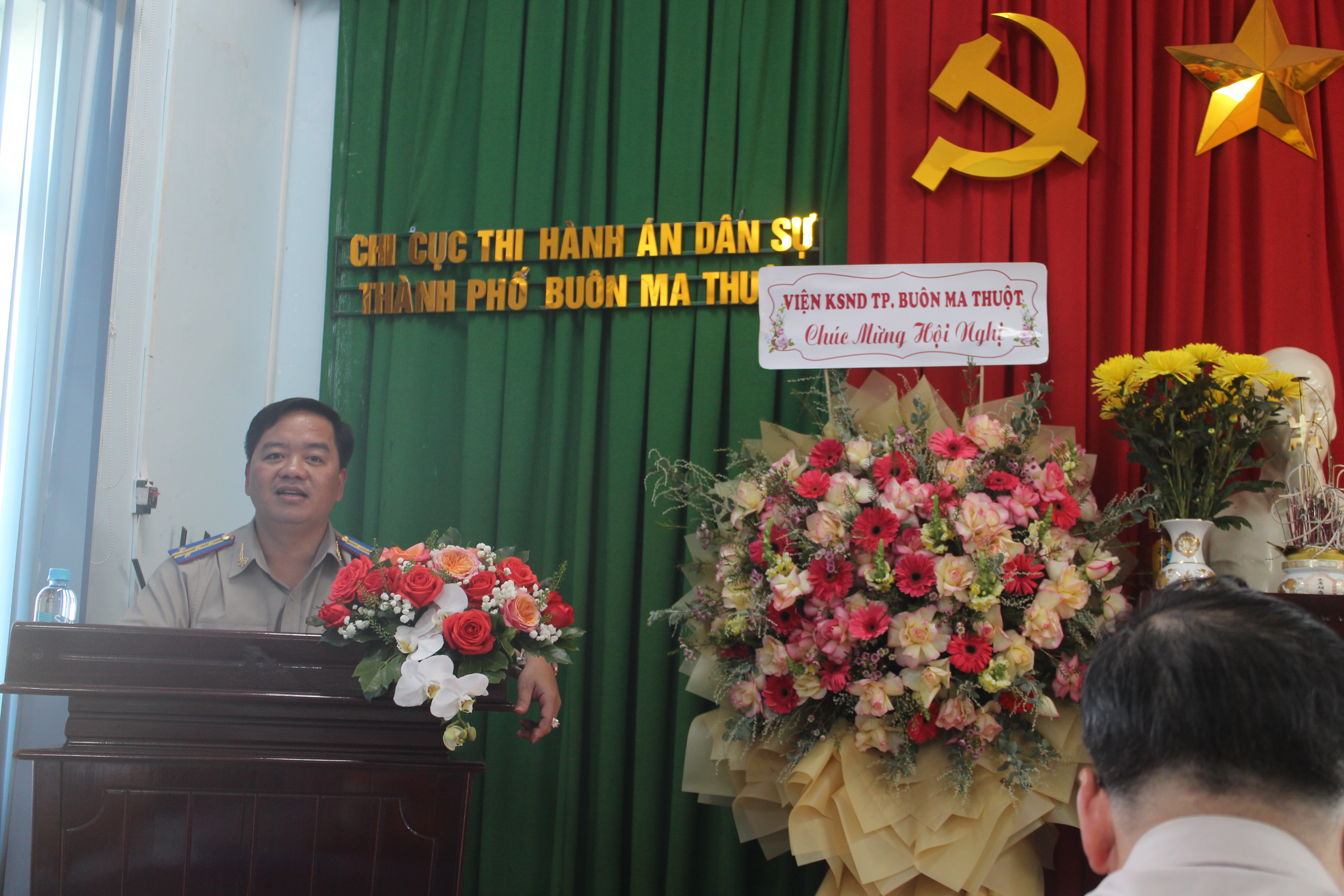 Tham dự và chỉ đạo hội nghị có đồng chí Vũ Tuấn Anh - Cục trưởng Cục Thi hành án dân sự tỉnh Đắk Lắk; đồng chí Phạm Tiến Hưng - Phó Chủ tịch Ủy ban nhân dân - Trưởng ban Chỉ đạo Thi hành án dân sự thành phố Buôn Ma Thuột, đồng chí Nguyễn Văn Liêm - Phó Chủ tịch Hội đồng nhân dân thành phố Buôn Ma Thuột và đại diện các cơ quan hữu quan tham dự gồm: Tòa án nhân dân thành phố Buôn Ma Thuột, Viện kiểm sát nhân dân thành phố Buôn Ma Thuột, Công an thành phố Buôn Ma Thuột, Chi nhánh Văn phòng đăng ký đât đai thành phố Buôn Ma Thuột. Trong năm 2023, Chi cục Thi hành án dân sự thành phố Buôn Ma Thuột đã đạt và vượt cả hai chỉ tiêu: