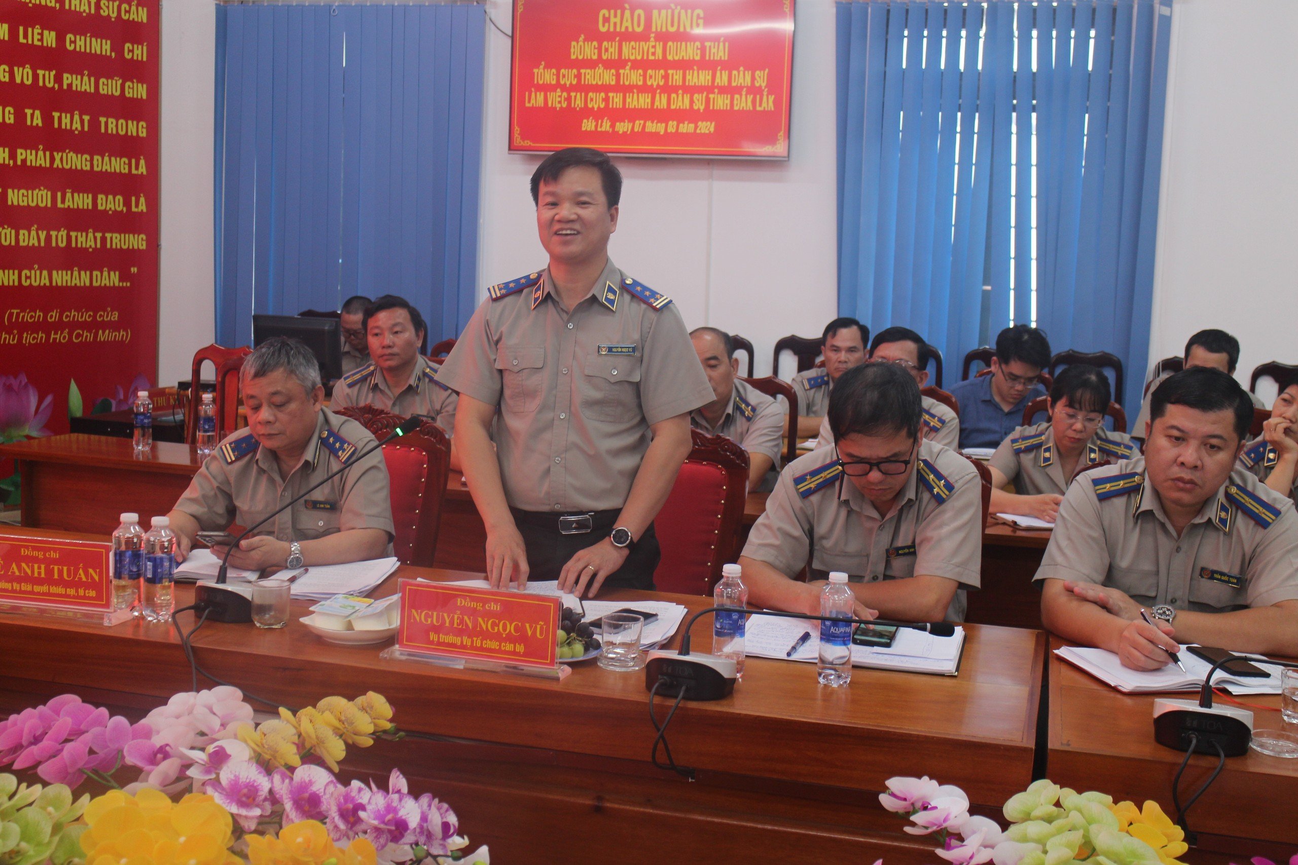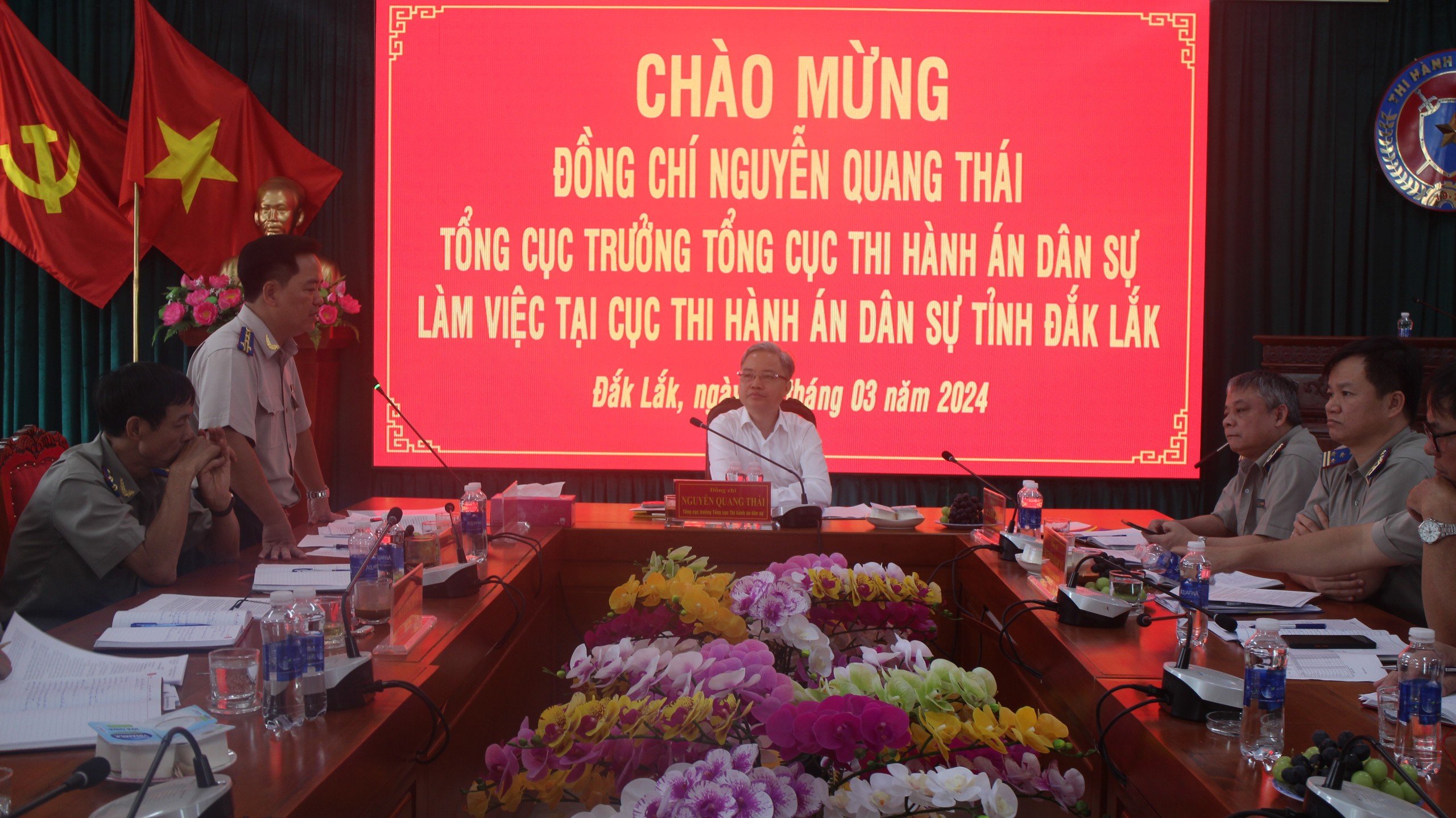 Tham dự buổi làm việc có Vụ trưởng Tổ chức cán bộ, Vụ trưởng Vụ Giải quyết khiếu nại, tố cáo; về phía Cục THADS tỉnh Đắk Lắk có tập thể lãnh đạo Cục, lãnh đạo các Phòng và tương đương thuộc Cục, công chức Cục và Chi cục trưởng các Chi cục THADS trực thuộc. Sau khi nghe đại diện lãnh đạo Cục báo cáo, ý kiến phát biểu của các đại biểu dự họp, Tổng Cục trưởng Nguyễn Quang Thái có ý kiến như sau: