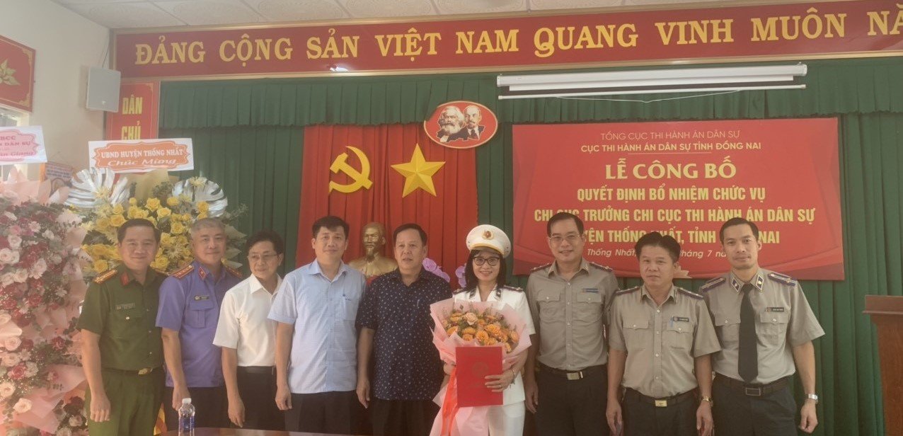Tại buổi lễ, ông Trần Văn Thuần – Phó trưởng phòng, phụ trách Phòng Tổ chức cán bộ Cục THADS tỉnh đã công bố Quyết định số 840/QĐ-TCTHADS ngày 04 tháng 7 năm 2024 của Tổng cục trưởng Tổng cục THADS về việc bổ nhiệm bà Hồ Thị Vân Giang, Chấp hành viên trung cấp, Phó Chi cục trưởng Chi cục THADS huyện Thống Nhất, tỉnh Đồng Nai giữ chức vụ Chi cục trưởng Chi cục THADS huyện Thống Nhất, tỉnh Đồng Nai, thời gian bổ nhiệm là 05 năm, có hiệu lực kể từ ngày 10 tháng 7 năm 2024.