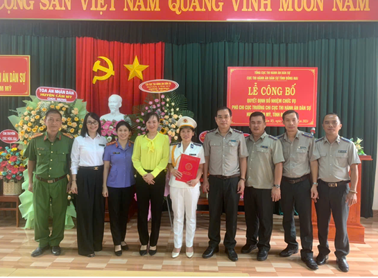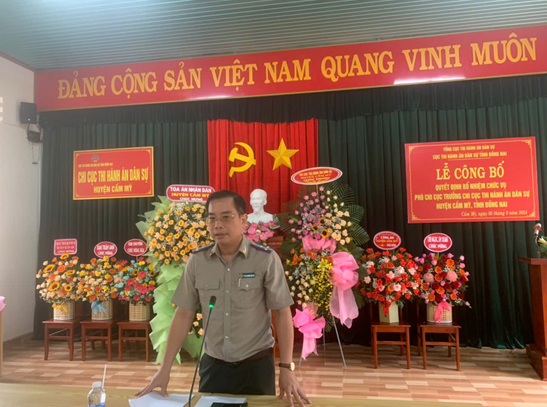 Tại buổi lễ, ông Trần Văn Thuần – Phó trưởng phòng, phụ trách Phòng Tổ chức cán bộ Cục THADS tỉnh đã công bố Quyết định số 1000/QĐ-CTHADS ngày 30 tháng 8 năm 2024 của Cục trưởng Cục THADS tỉnh Đồng Nai về việc bổ nhiệm bà Lê Thị Hòa, Chấp hành viên sơ cấp Chi cục THADS huyện Cẩm Mỹ, tỉnh Đồng Nai giữ chức vụ Phó Chi cục trưởng Chi cục THADS huyện Cẩm Mỹ, tỉnh Đồng Nai, thời gian bổ nhiệm là 05 năm, có hiệu lực kể từ ngày 10 tháng 9 năm 2024.