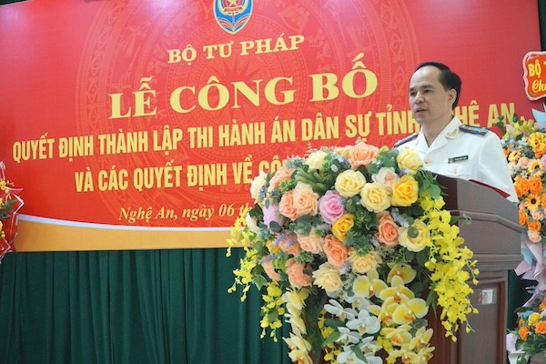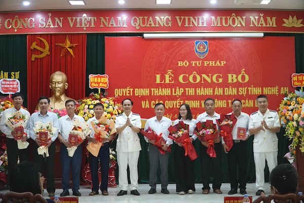 Sáng 6/7, Bộ Tư pháp tổ chức Lễ công bố Quyết định thành lập Thi hành án dân sự (THADS) tỉnh Nghệ An và công bố, trao các quyết định về công tác tổ chức cán bộ theo Đề án “Tiếp tục sắp xếp, tinh gọn bộ máy, hệ thống tổ chức THADS bảo đảm hoạt động hiệu lực, hiệu quả”.