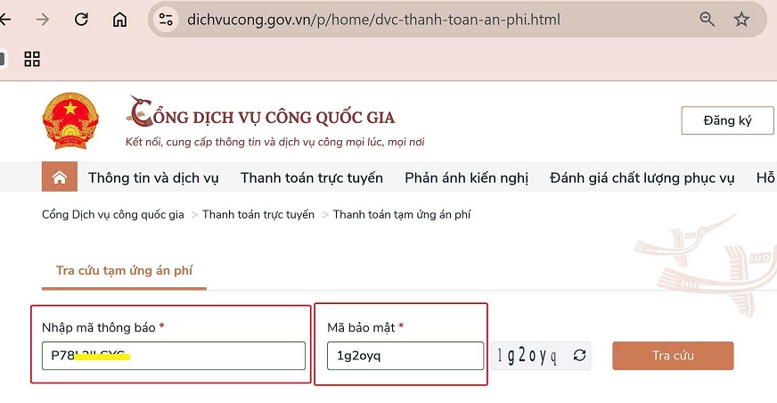 - Tại mục Thanh toán trực tuyến trên Cổng DVCQG, công dân chọn mục Nộp tạm ứng án phí và chuyển khoản tiền tạm ứng án phí theo hướng dẫn trên Cổng DVCQG.