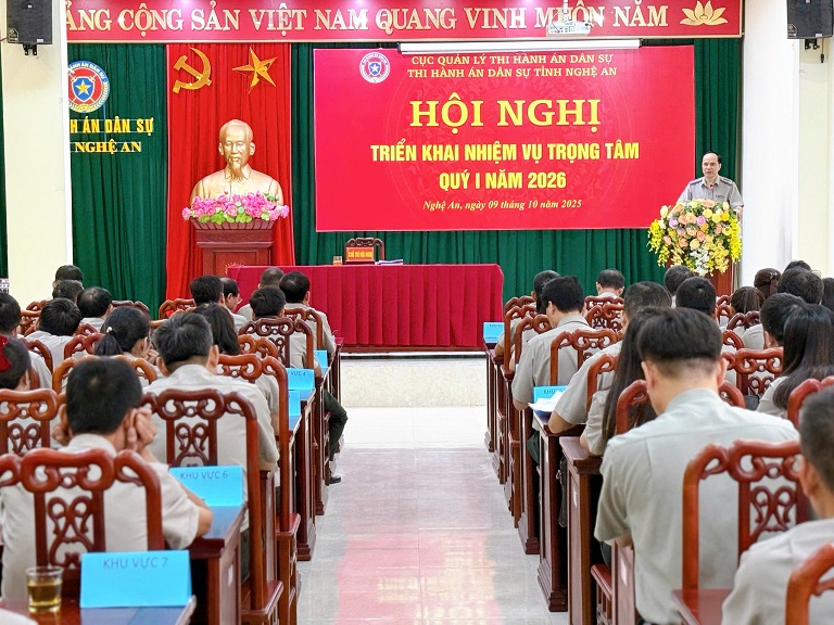 Để kịp thời đánh giá kết quả thực hiện chỉ tiêu, nhiệm vụ năm 2025 và triển khai nhiệm vụ trọng tâm quý I năm 2026 ngay từ những ngày đầu, tháng đầu của năm công tác, sáng ngày 9/10/2025, Thi hành án dân sự tỉnh Nghệ An tổ chức Hội nghị triển khai nhiệm vụ trọng tâm quý I năm 2026. Tham dự Hội nghị có sự tham gia của Lãnh đạo THADS tỉnh, lãnh đạo các phòng chuyên môn, lãnh đạo Phòng THADS các khu vực và toàn thể Chấp hành viên, Thẩm tra viên THADS tỉnh Nghệ An.