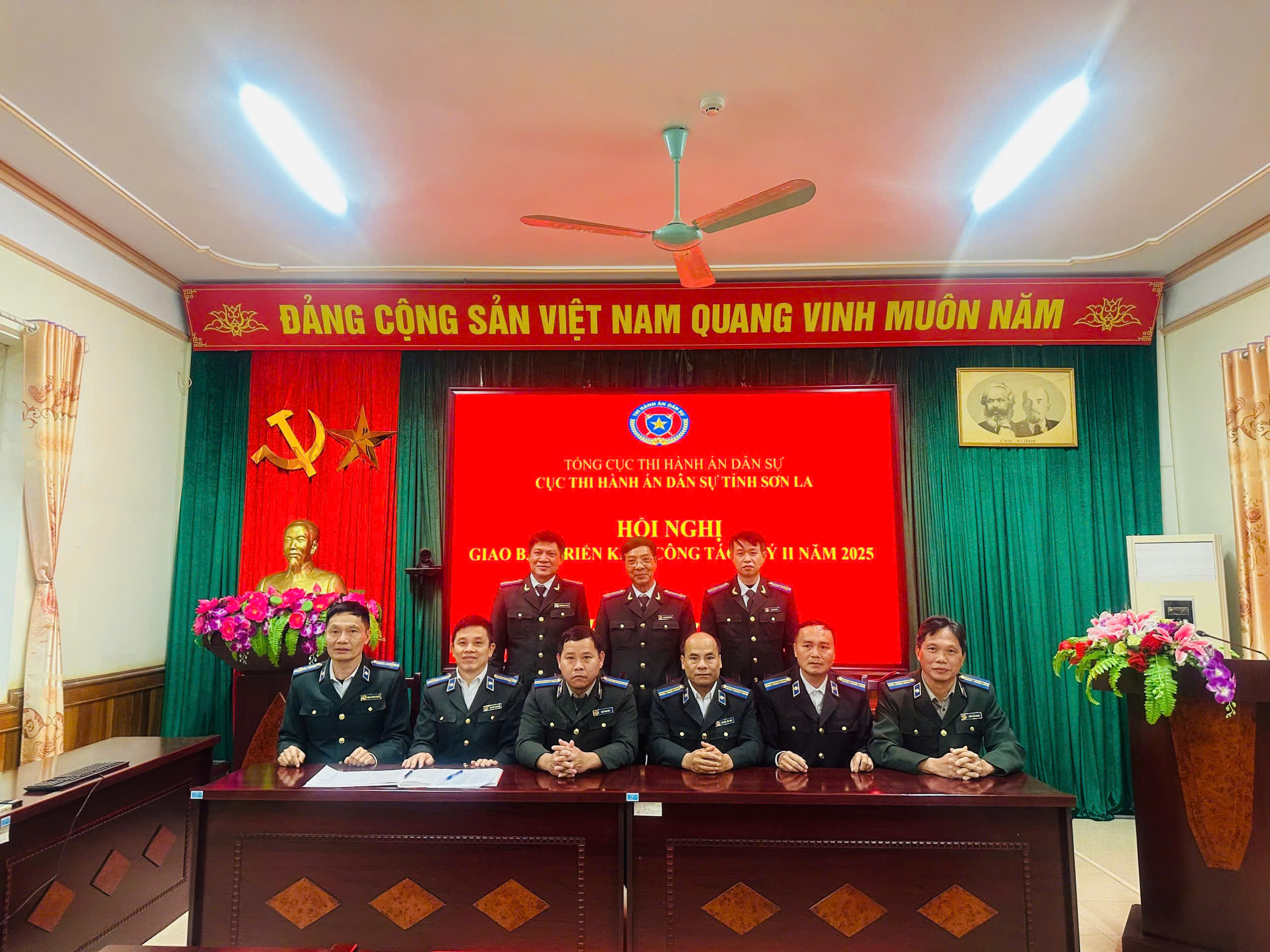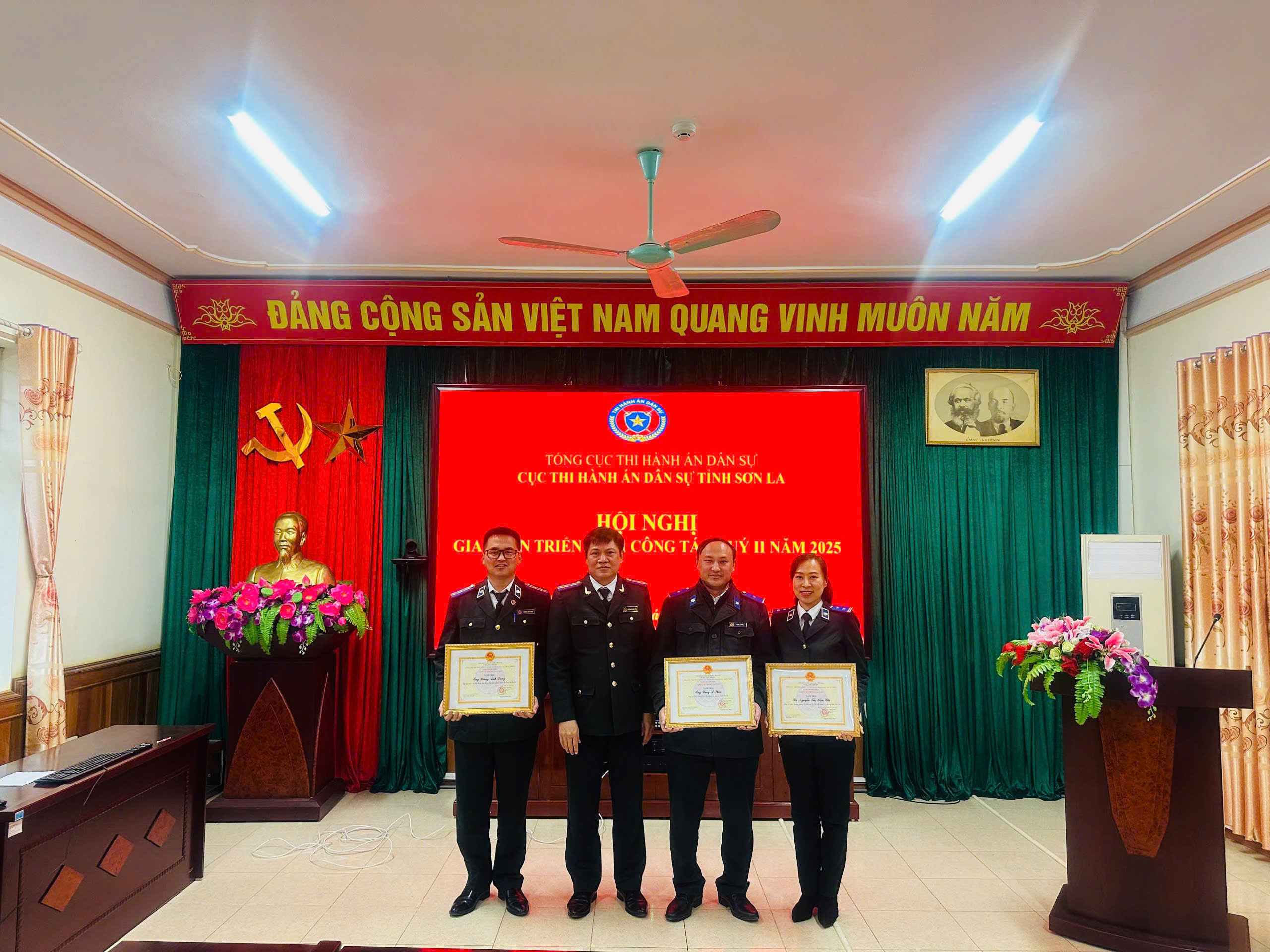 Tại Hội nghị đã thông qua quyết định của Bộ Tư pháp về trao kỷ niệm chương “Vì sự nghiệp Tư pháp” cho 03 cá nhân; quyết định của Chủ tịch Ủy ban nhân dân tỉnh Sơn La tặng Kỷ niệm chương “Vì sự nghiệp xây dựng và phát triển tỉnh Sơn La” khen thưởng cho 02 cá nhân và quyết định của Tổng Cục trưởng Tổng Cục THADS về việc tặng danh hiệu thi đua và hình thức khen thưởng đối với đối với 02 tập thể và 09 các nhân có thành tích suất sắc trong năm 2024. Tổ chức phát động thi đua giữa các Phòng chuyên môn thuộc Cục chi cục THADS huyện, thành phố trong tỉnh; ký cam kết thi đua hoàn thành tốt chỉ tiêu, nhiệm vụ năm 2025 và thực hiện nghiêm công tác Phòng chống tham nhũng, tiêu cực trong công tác THADS.
