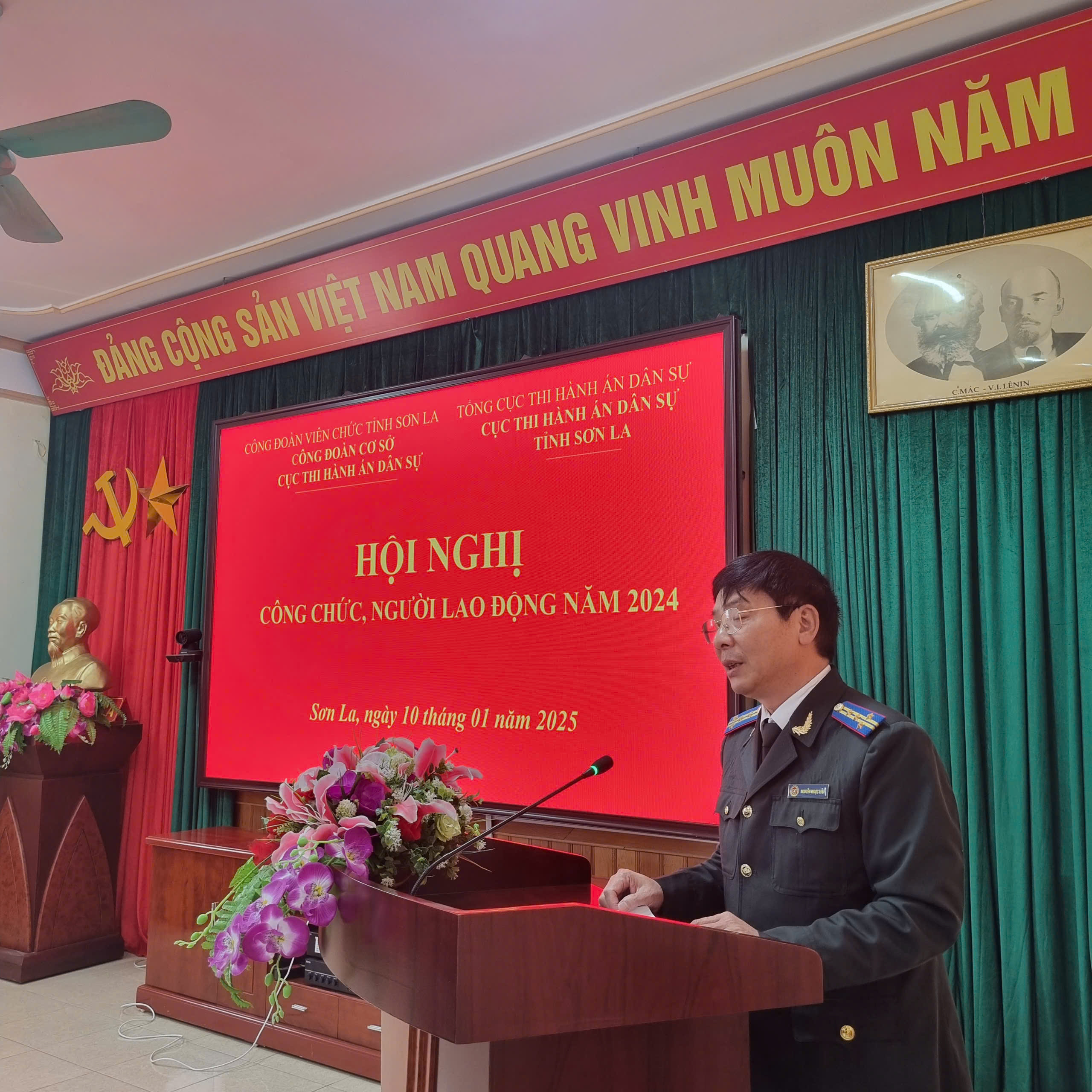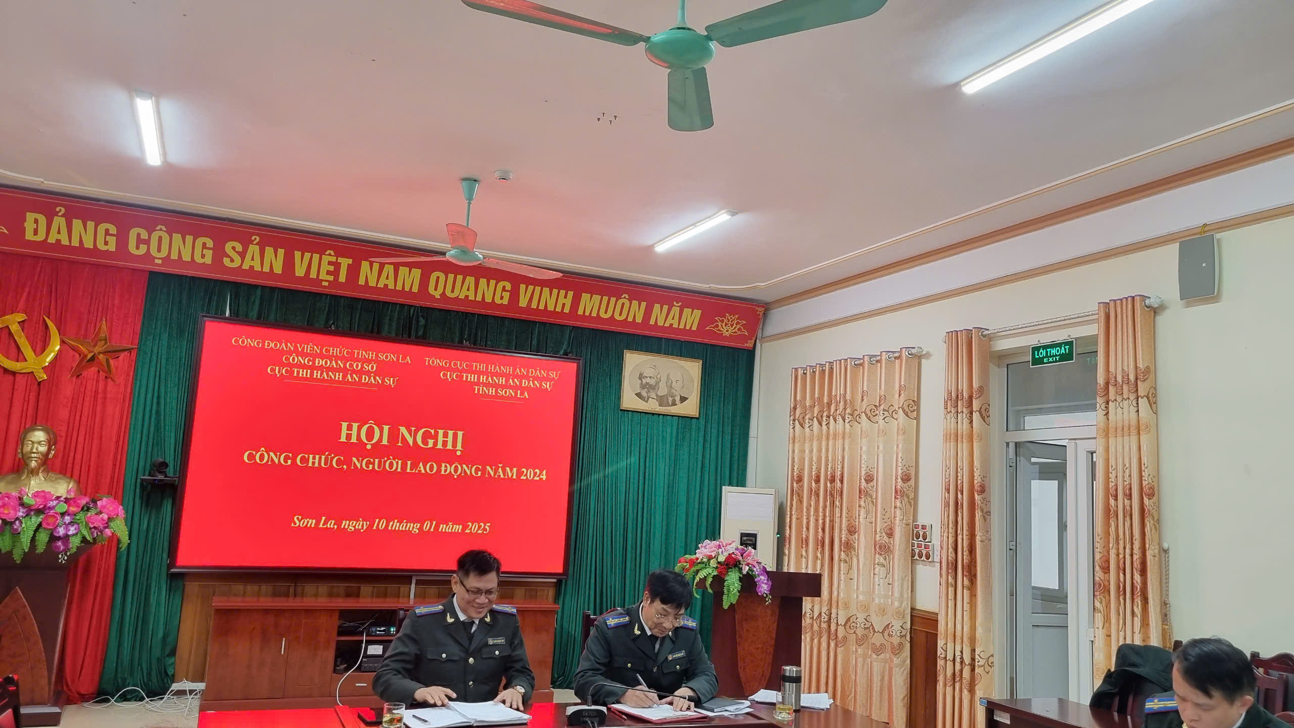 Thực hiện Luật Thực hiện dân chủ ở cơ sở năm 2022; Nghị định số 59/2024/NĐ-CP ngày 14/8/2024 của Chính phủ quy định chi tiết một số điều của Luật Thực hiện dân chủ ở cơ sở; Quy chế thực hiện dân chủ trong hoạt động của Cục Thi hành án dân sự tỉnh Sơn La. Thủ trưởng và Ban Chấp hành Công đoàn Cục Thi hành án dân sự tỉnh Sơn La tổ chức Hội nghị cán bộ công chức năm 2024 nhằm đánh giá kết quả đã đạt được, chỉ ra những tồn tại hạn chế trong thực hiện Nghị quyết hội nghị công chức người lao động năm 2023 và thực hiện chủ trương của Đảng, chính sách pháp luật của Nhà nước, đồng thời tìm ra giải pháp để tháo gỡ những khó khăn, vướng mắc phấn đấu hoàn thành tốt chỉ tiêu, nhiệm vụ được giao năm 2025.