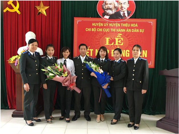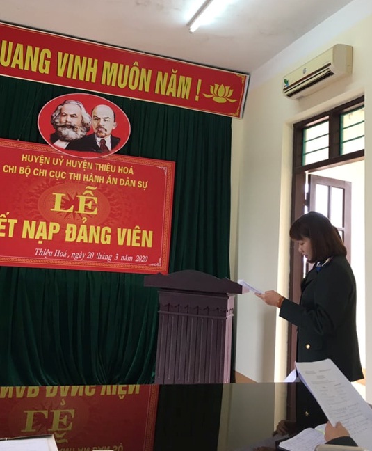Căn cứ Điều 4, Điều lệ Đảng cộng sản Việt nam. Xét đơn xin vào Đảng của quần chúng Bùi Thị Luận và quần chúng Nguyễn Thị Thủy. Sáng ngày 20/3/2020 chi bộ Thi hành án dân sự huyện Thiệu Hóa đã tổ chức kết nạp cho 2 quần chúng Bùi Thị Luận, Nguyễn Thị Thủy vào Đảng Cộng sản Việt Nam.
